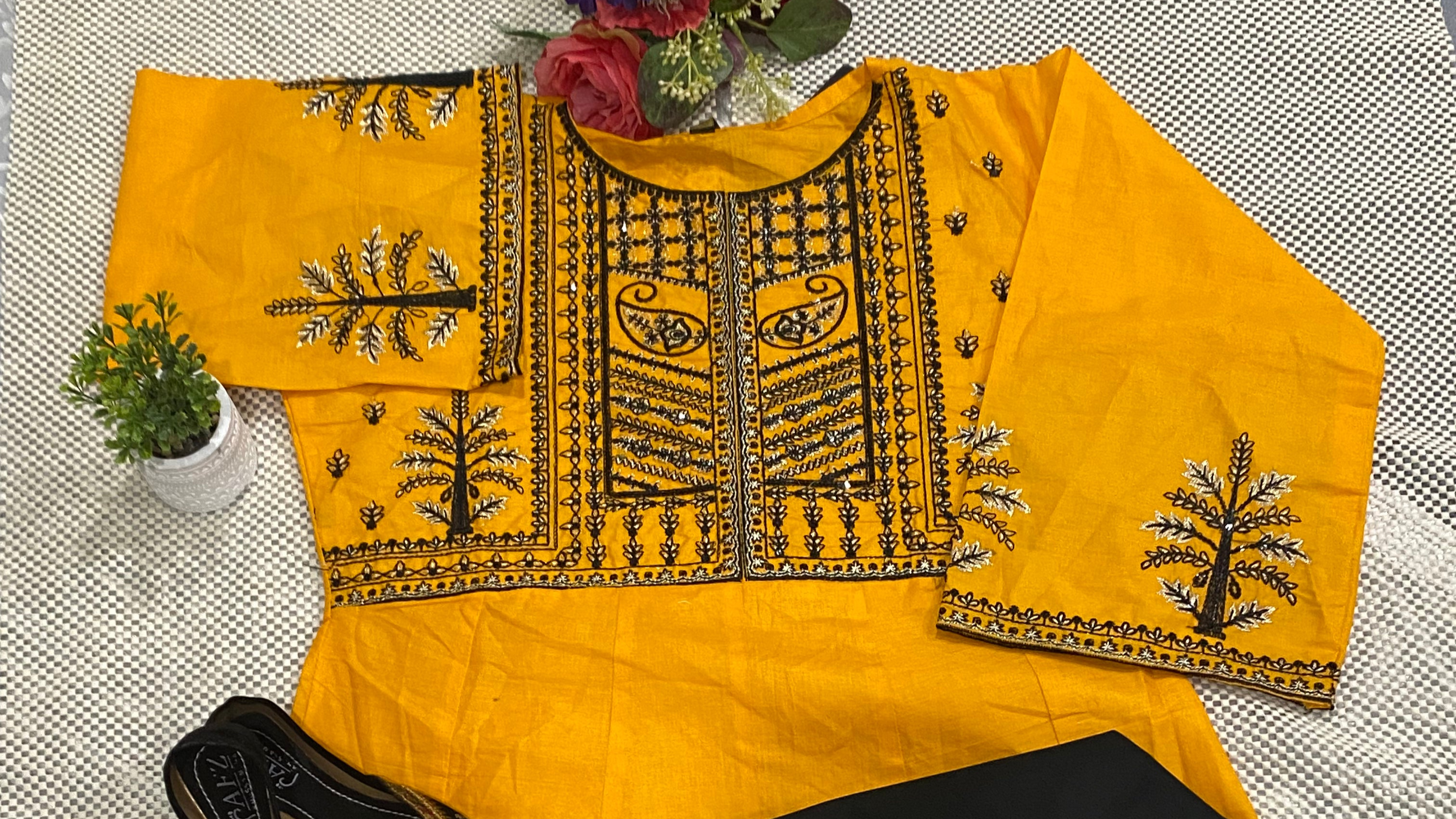 Girls' yellow silk embroidered frock with soft inner and matching yellow and gold gharara.