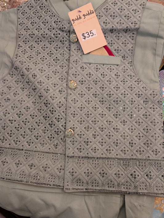 Boys' dusty blue kurta pyjama with a sequence work waistcoat