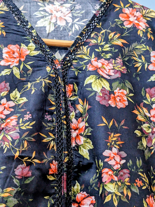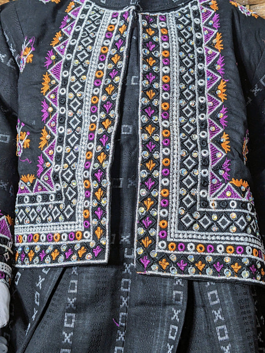 Girls black printed and embroidered linen shirt with matching trouser and dupatta