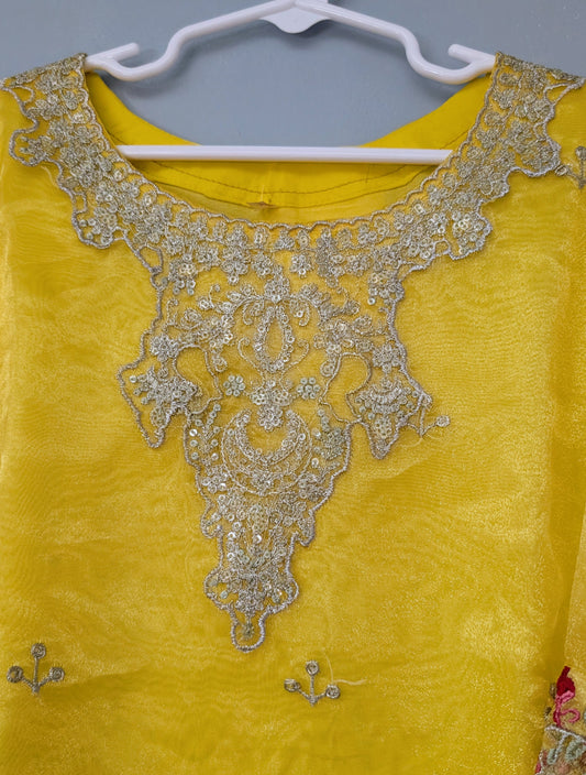 Girls yellow organza fully embroidered maxi with yellow silk trouser and gold dupatta