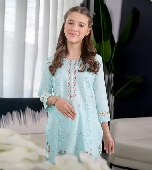 Girls light turquoise fully embroidered lawn kurta with matching trouser