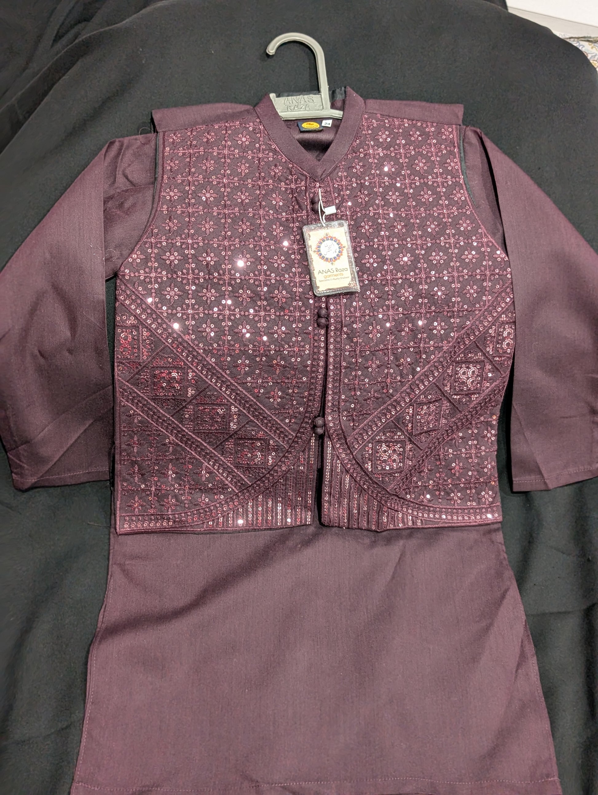 Boys burgundy kurta pajama set with a sequence work waistcoat