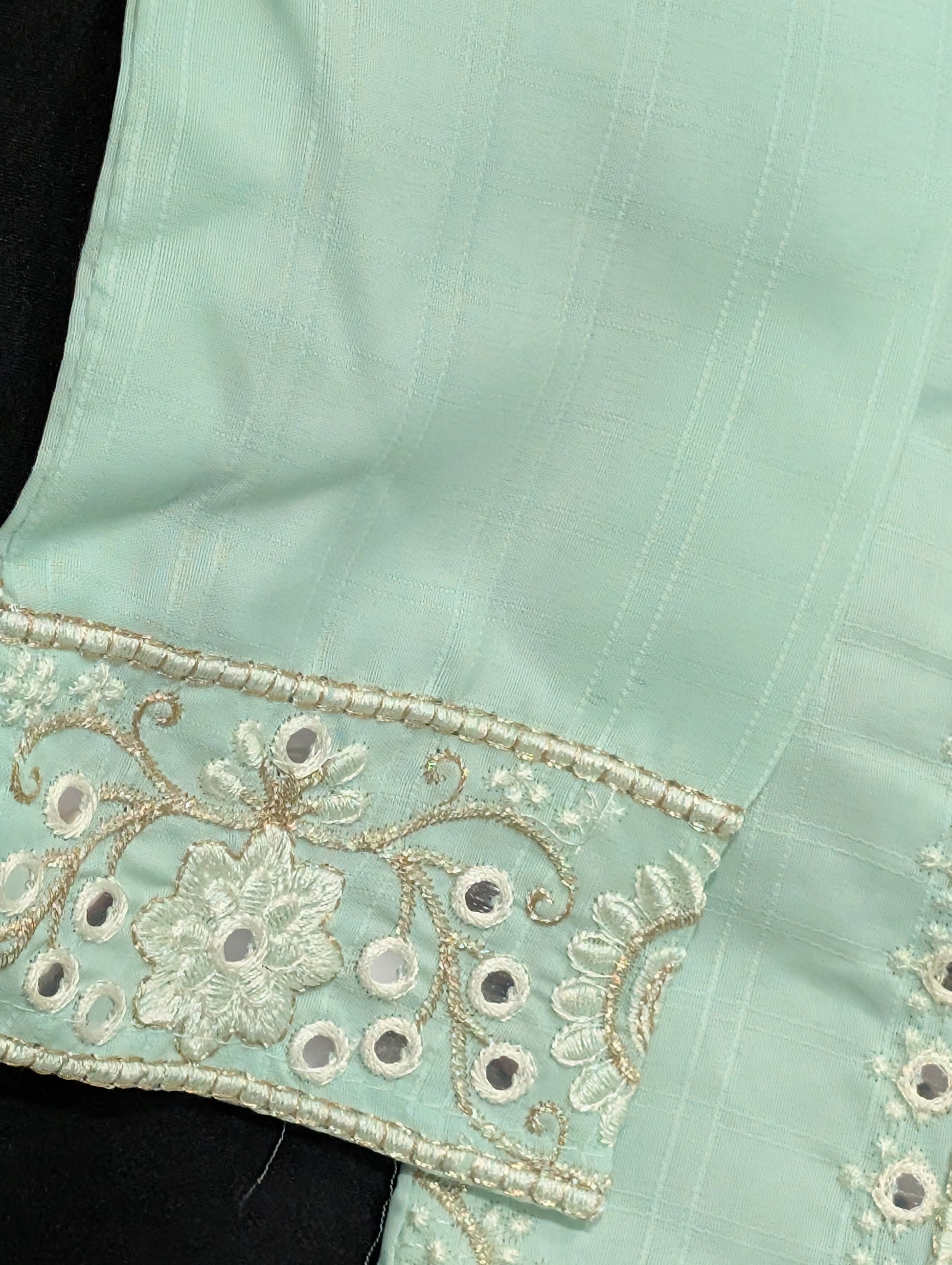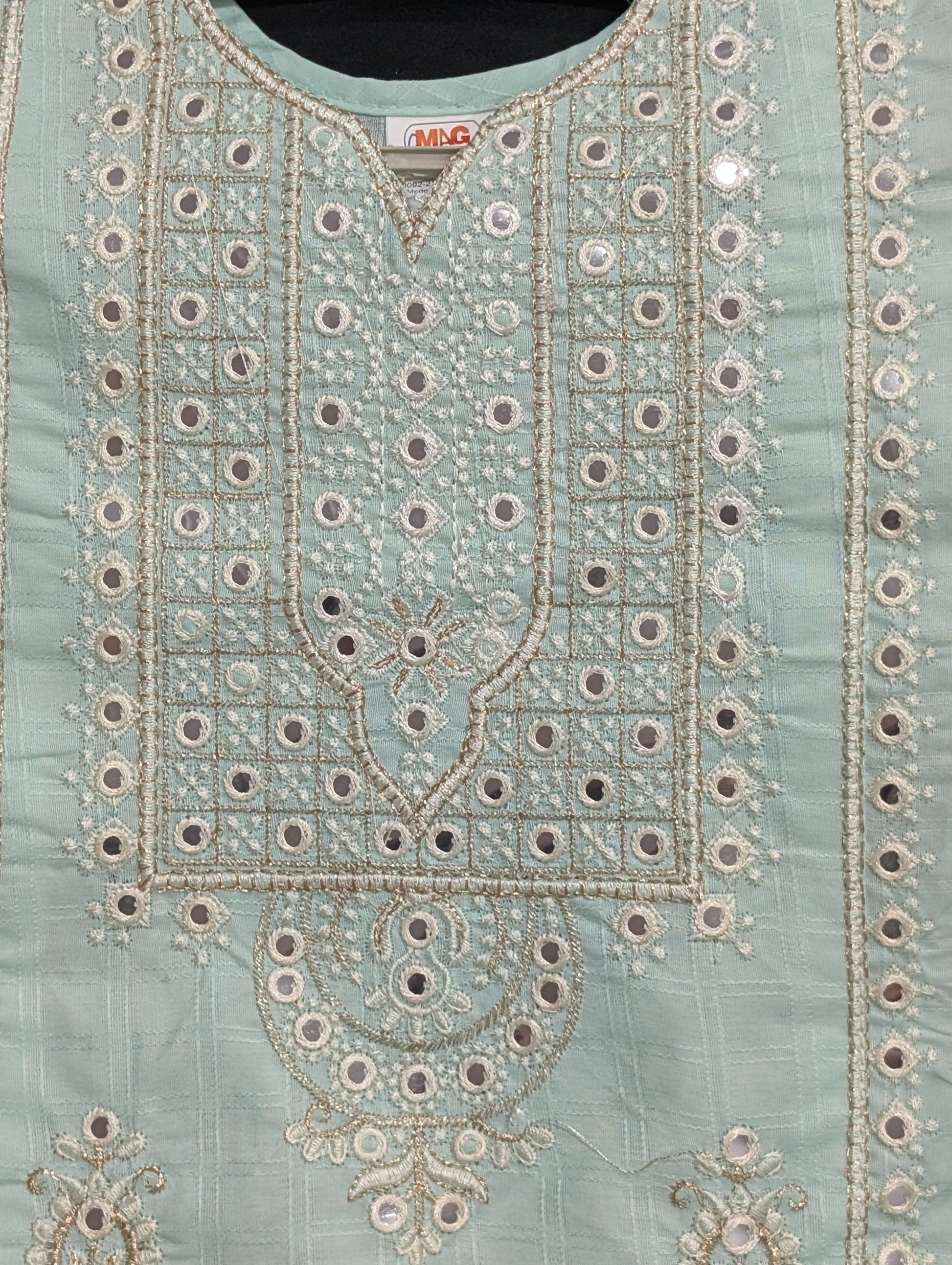 Girls' cotton dress with full mirror work embroidery and matching pants.