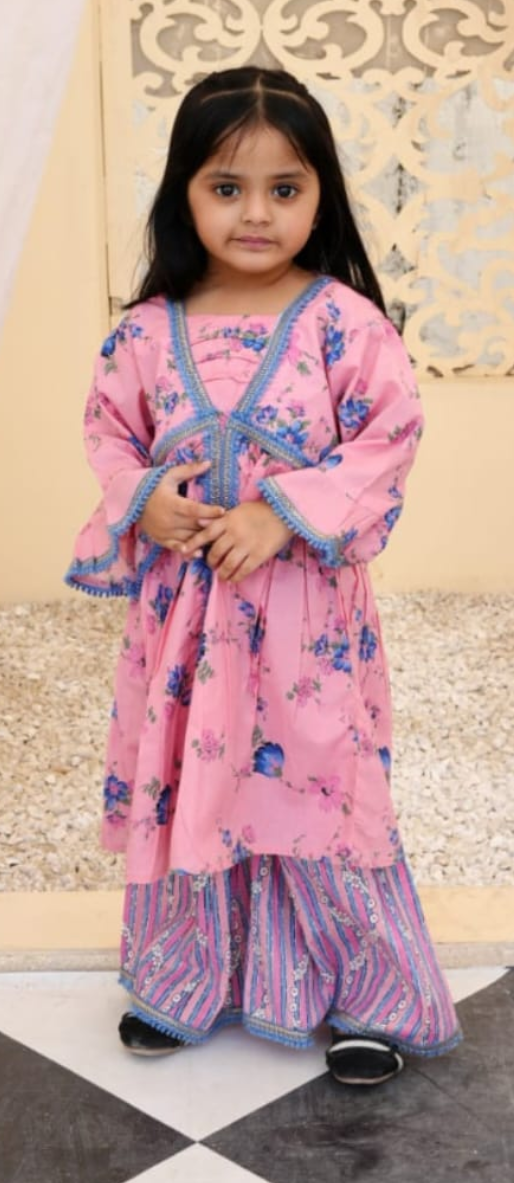 Girls cotton lawn pink frock with mix and match purple gharara